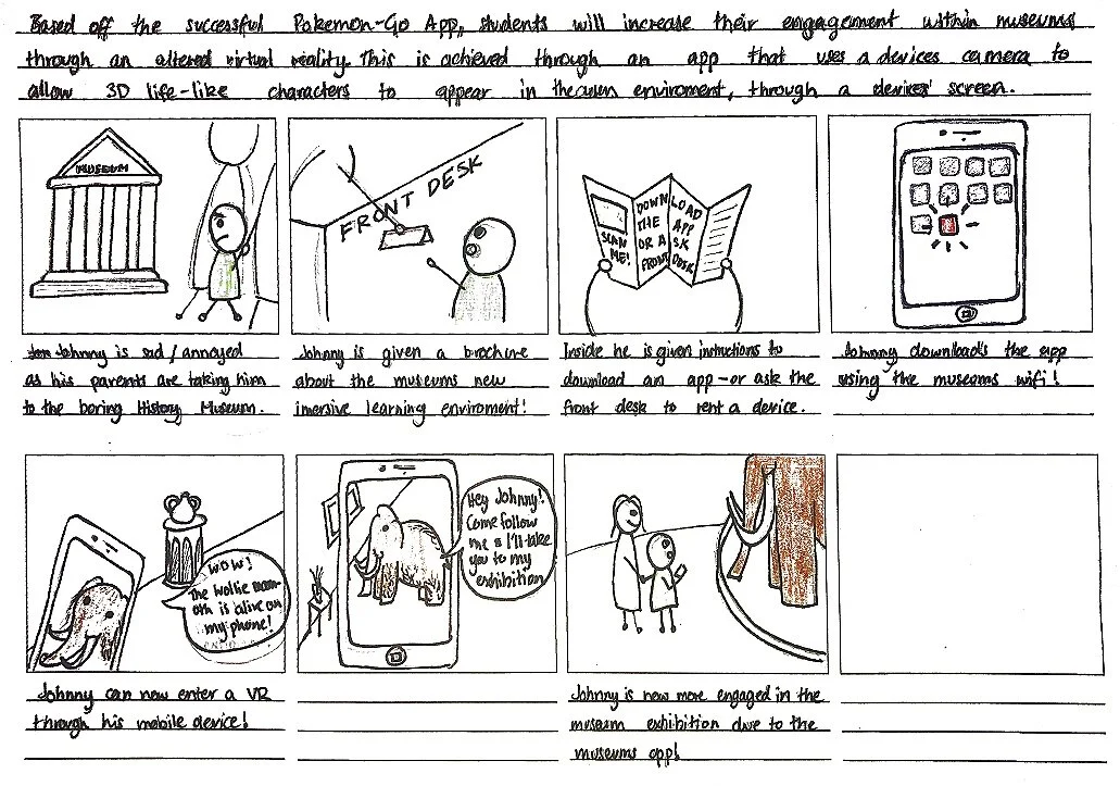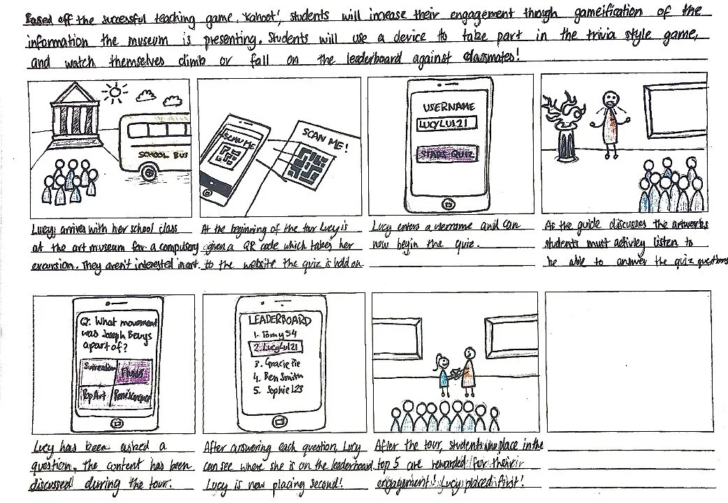 Inspired from the game-based learning platform Kahoot, I elaborated the idea and applied it to develop the trivia game app concept. The storyboard on the right explains the app visually. The concept consists of students arriving to the museum and downloading the ‘Trivia Game App’. They create a username and select a ‘tour group’. Throughout the tour with a museum representative students will be quizzed on information the guide is teaching them. After each set of questions students are able to view themselves on a leaderboard. They will climb or fall on the leaderboard based on how fast they answer a question and if they are correct or incorrect.